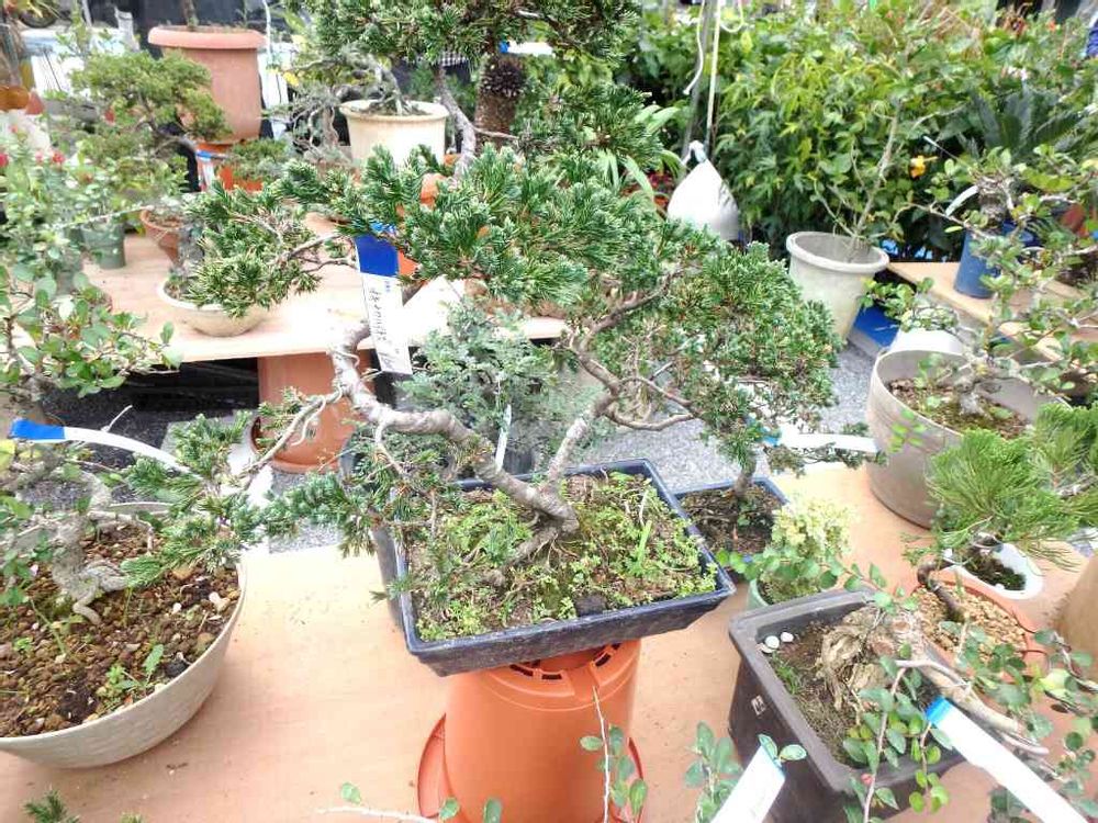 オキナワハイネズ。盆栽風。海岸の砂地に自生している針葉樹だそう。小笠原諸島に自生するシマムロ(=ネズ Juniperus taxifolia)という低木の変種。初めて見た。問題は置き方。