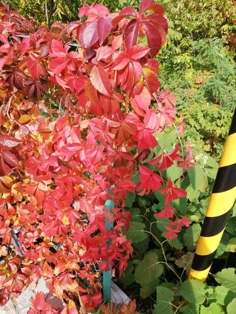 違うアングルのアメリカヅタの紅葉🍁こんなに赤くなるんですね!雑草だらけですが林みたいなもんなんで半分諦めてます😅