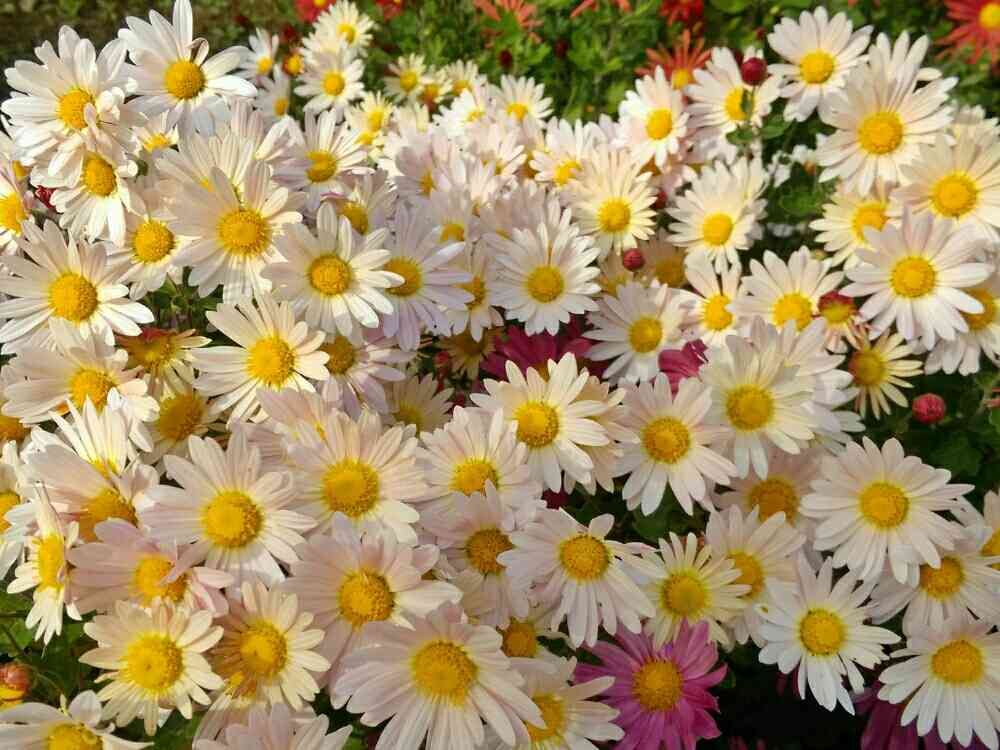 たくさんの白い菊が柔らかいクリーム色に染まっていて