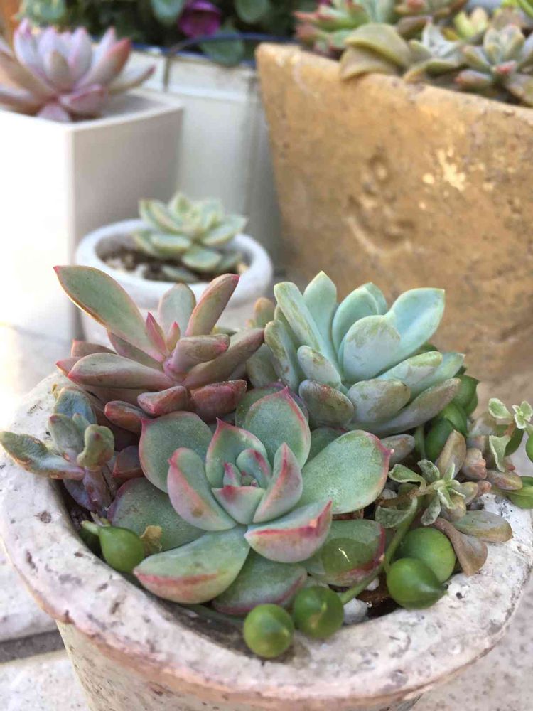特に周りに添えた「覆輪丸葉万年草」がどうしても元気ないと思えば、多肉ちゃんと同じく水を切ってはダメと先輩方の記事から感じ取りピンポイントの水やりを実践し始めました(^。^)
