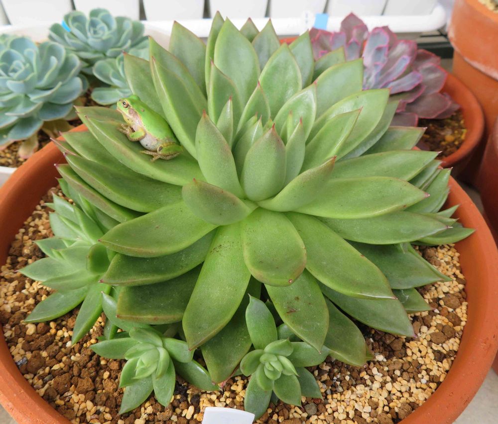 「私はアガボイデス」という台詞が聞こえてきそうなアマガエル。なんだか誇らしげにさえ見える。それにしてもこのアガボイデス,肥料も薬もなしでどんどん大きくなる。子株を取ってもまたすぐに増えて元気いっぱい。