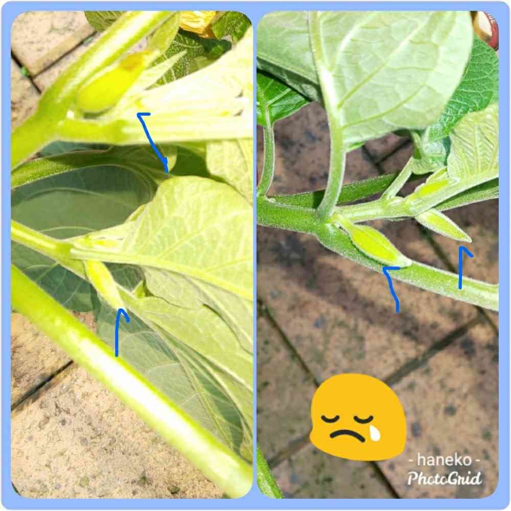 何度もお花を見せてくれたエンジェルストランペットさん、冬越ししやすいサイズに切り詰めたら、まだ6つも蕾を着けていました👀‼️(青矢印の所ですね)
