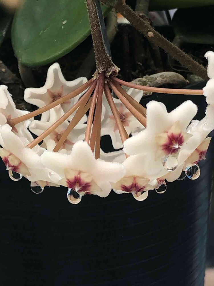ホヤ カルノーサホワイトの花がもう咲き終わるかなぁ〜と見たら こんななってました❗️水滴💧でも雨粒でもありません❗️