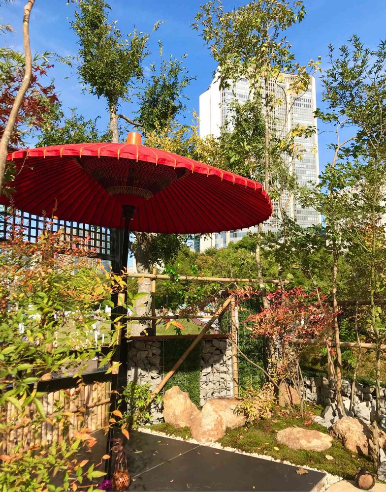 日本庭園の後ろに高層ビル