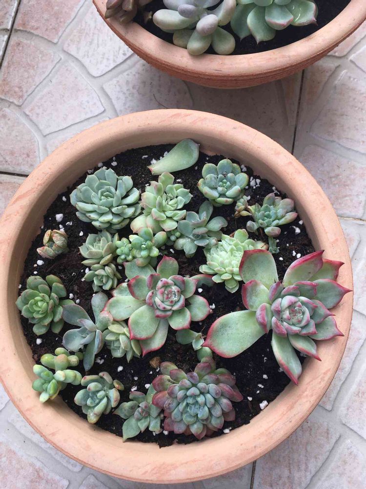 寄せ植えしようかな…と思ったものの息子起きたりで面倒になって育成畑に😅みんなどんどん大きくなーれー🎉葉っぱ一枚のがチワワさんということ以外誰も名前わかりません🤣チワワさんの葉挿しも外葉から芽が出始めました!大きくなりますように…