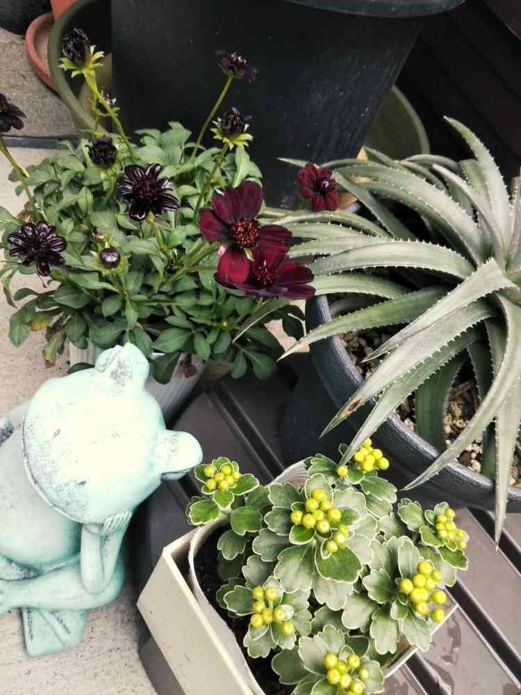 先日、仲良くして頂いてるフォロワーさんのお店で連れカエルしたチョコレートコスモスとイソギク。