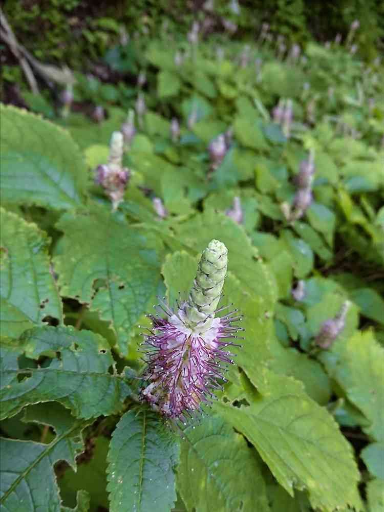山地の林下や沢沿いに生えるシソ科の落葉低木。茎の下部は木質化して低木状となり、高さ70㎝程になる。紅紫色の小さな花が多数集合して花穂を構成しブラシ状になり、長く飛び出した雄しべと花柱がよく目立つ。
