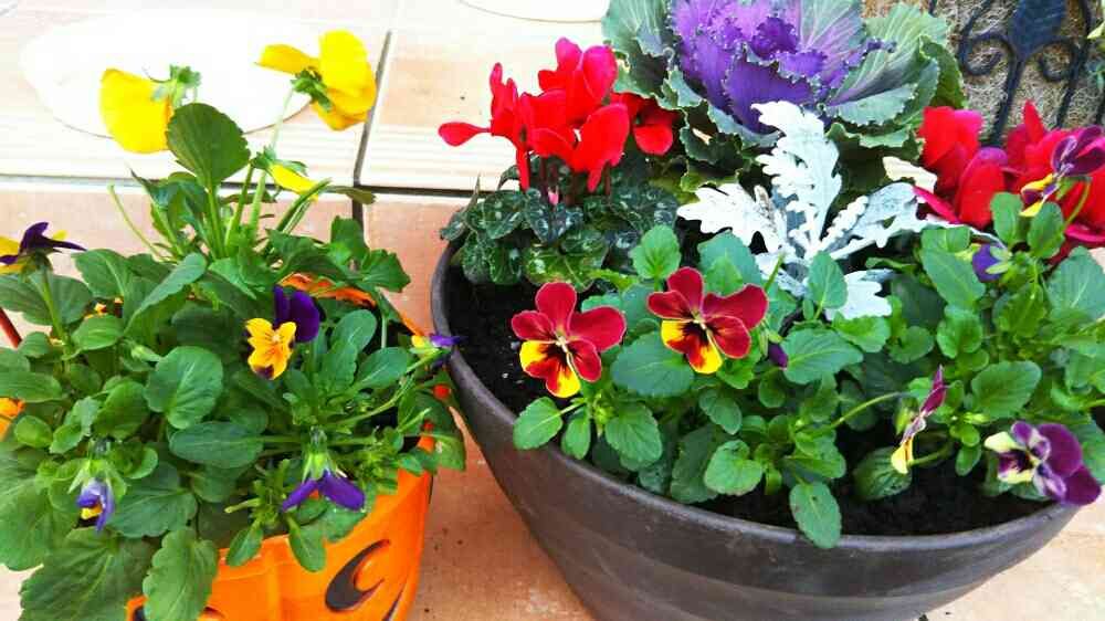 寄せ植え❗パンジーとビオラ。シクラメンも。並べると可愛いらしさましますね。赤と黄色のビオラ!紫と黄色のビオラどちらもいい掛け合わせができた種。