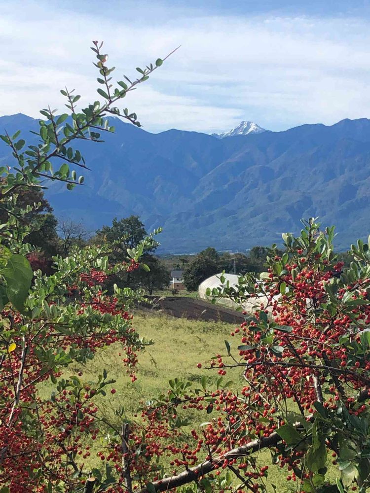 色付いたピラカンサと、冠雪の南アルプス北岳。