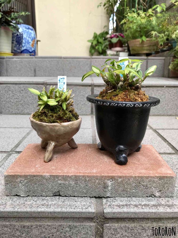左側の妻の長生蘭を、駄温鉢から先日頂いた手捻り鉢に引越しさせてみました⤴︎⤴︎