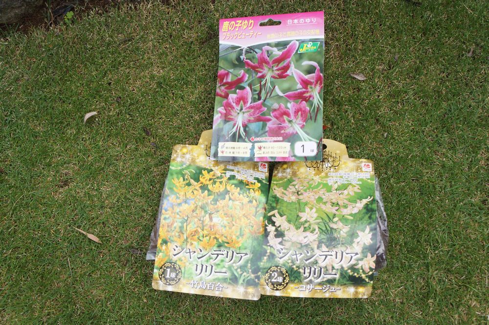 ユリ球根 鹿の子ユリ「ブラックビューティ」、シャンデリアリリー「コサージュ」、竹島百合。10月27日植え付け。香りが良いオリエンタルリリーと迷ったんですが・・・好みの花の方をとってみました。