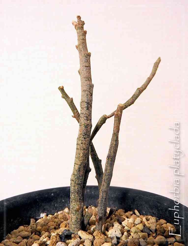我が家史上最も地味な多肉登場! そこらへんの枯れ枝を突っ込んだら、即、そっくりさんがつくれそうです。……がこれはユーフォルビア、プラチクラダ。普通見かけるのより細くて枝みたい。