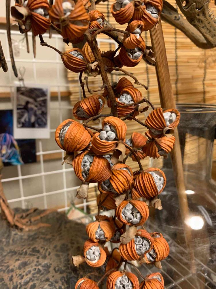 オレンジ色の実が沢山付いていて、中から白っぽい種?が見えています。