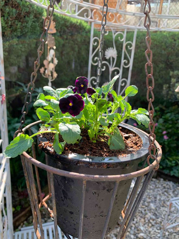 黒いビオラを鉢植えにして ガゼボに吊るしました