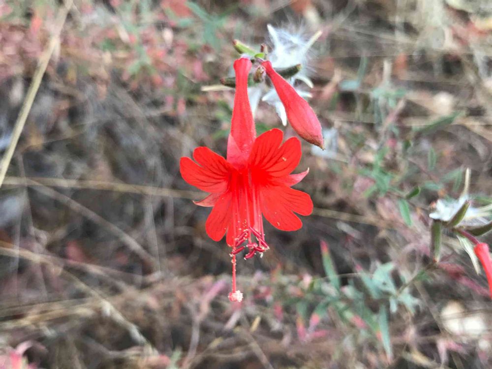 Rancho Canada Del Oro Open Space へハイキング。トレイルの脇にひっそり咲いている赤い花を見つけました。California fuchsiaという花でした。学名 Epilobium canum。アカバナの仲間だそうです。