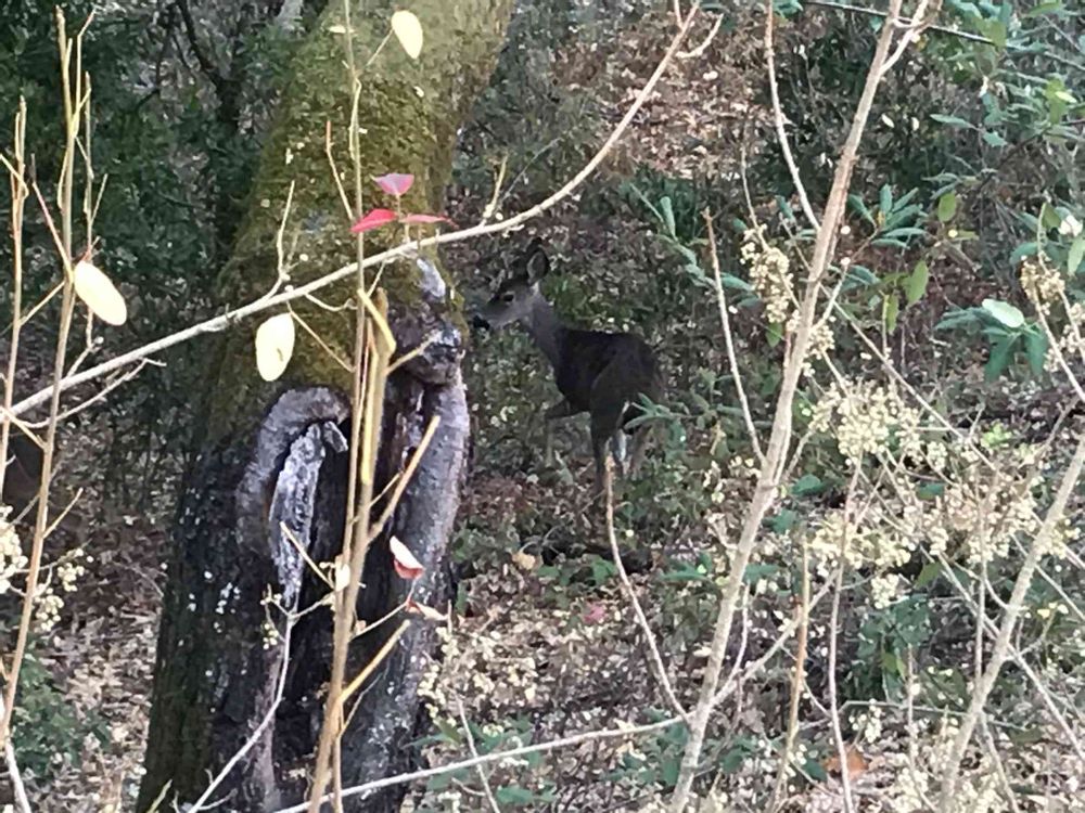 トレイル近くの茂みにカリフォルニア・ミュールジカがいました。なかなか警戒心が強く、近寄って写真を撮らせてくれません。