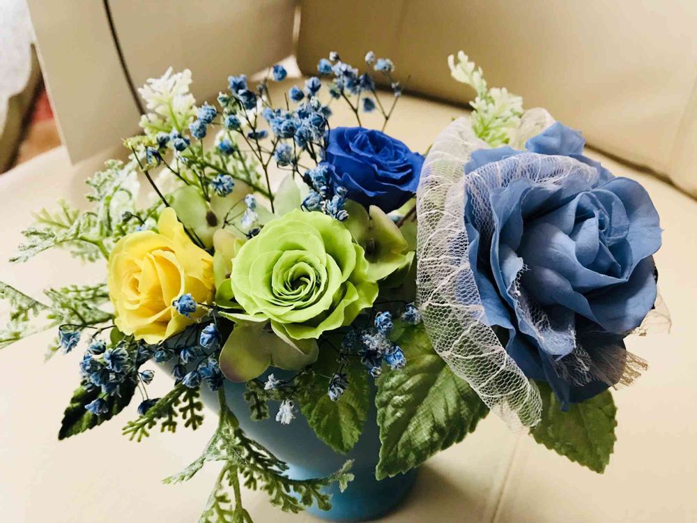 ブルーのプリザーブドフラワーを使ってのアレンジは爽やかさもあり落ち着いた感じになるので好きなのですが色褪せが早いので使うのをためらいます💦