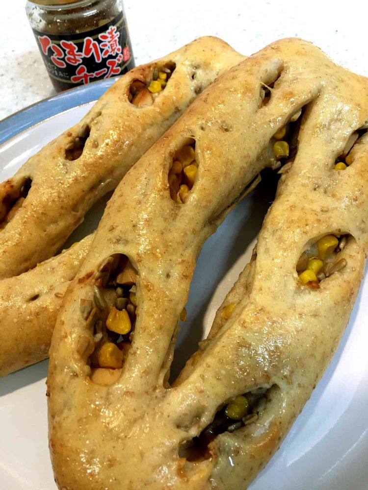 栃木県のたまり漬けチーズを頂いたのでトウモロコシと一緒に中に入れました。焼き上がりにオリーブオイルを塗り熱々をこれからいただきま〜す🍽