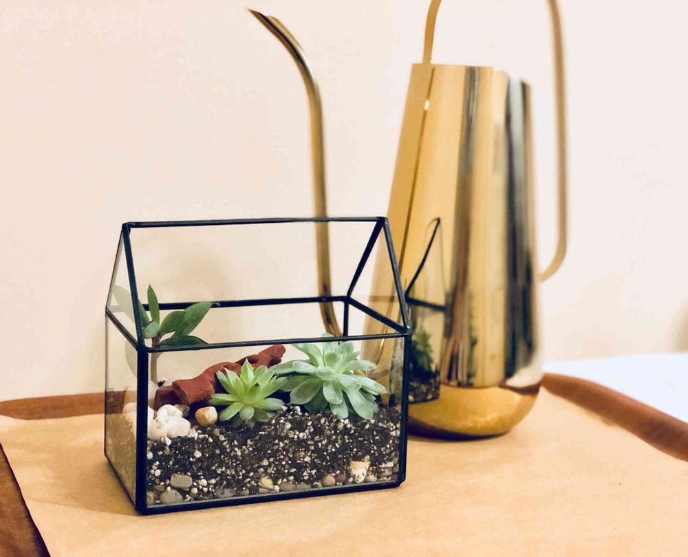 初めての寄せ植え。お店で見かけたテラリウムに、土と石とアクセントの木枝も入れてみました。住み心地のいい家になるといいな。