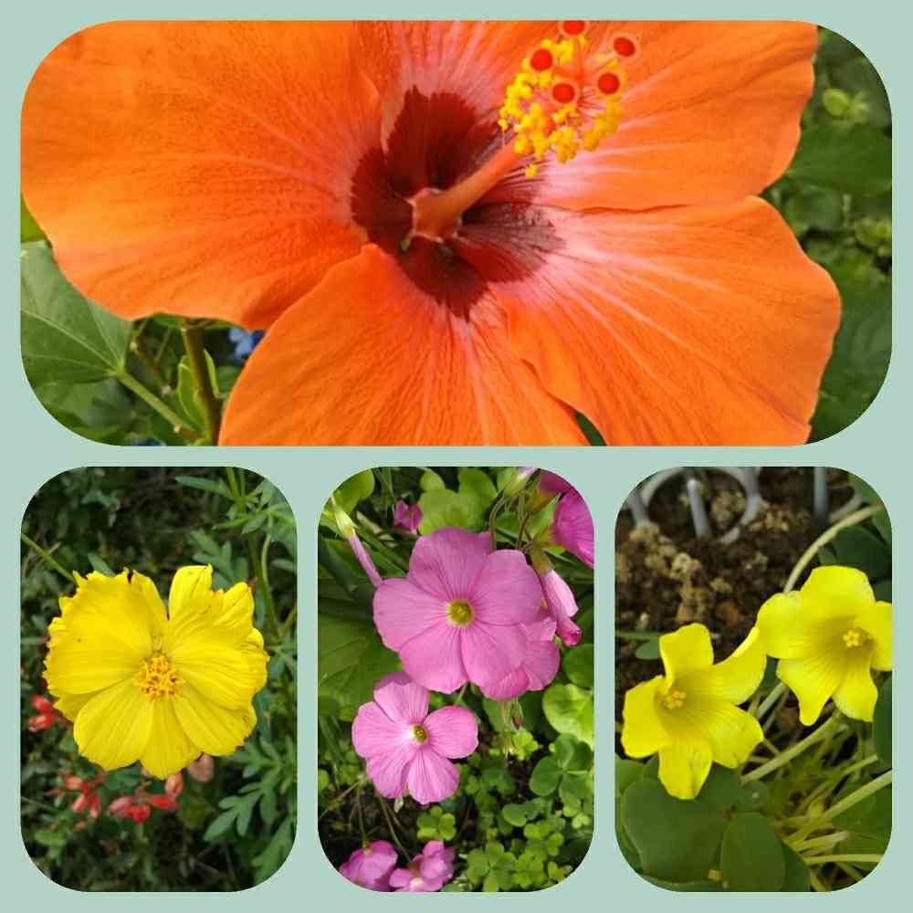 きのう散歩の途中で出会った花です。まだハイビスカスが咲いていました。オギザリスとキバナコスモスも。