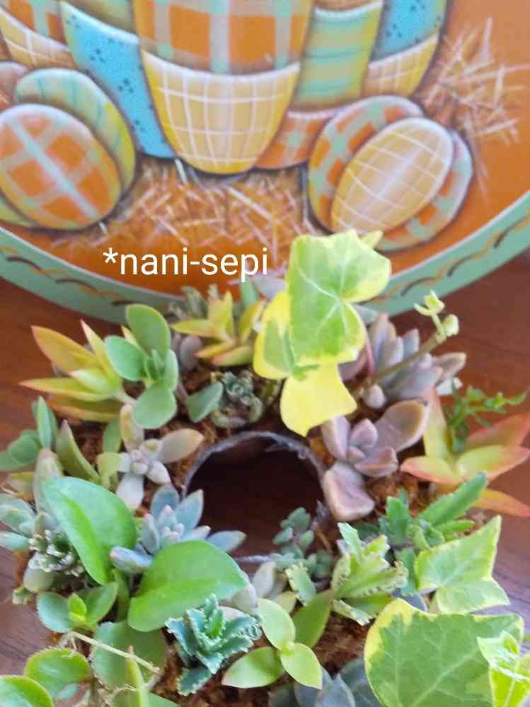 🍩型の卵ケースに多肉と、観葉植物で、作りました。リース。NO.3