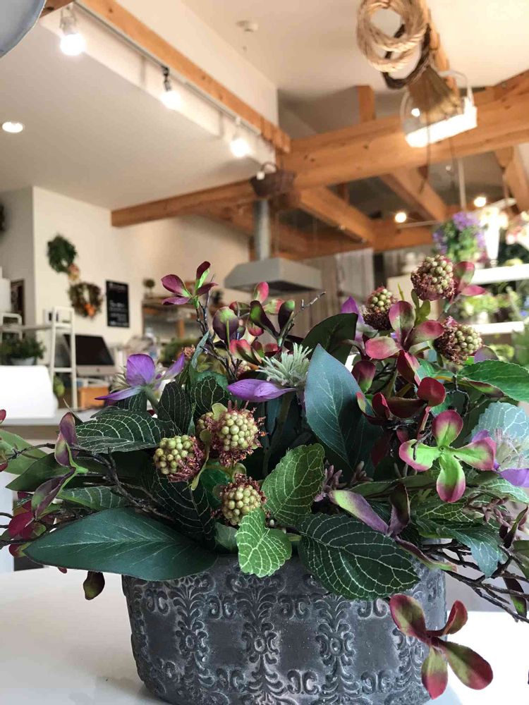 こちらは秋の色と葉っぱを多用したアレンジ。