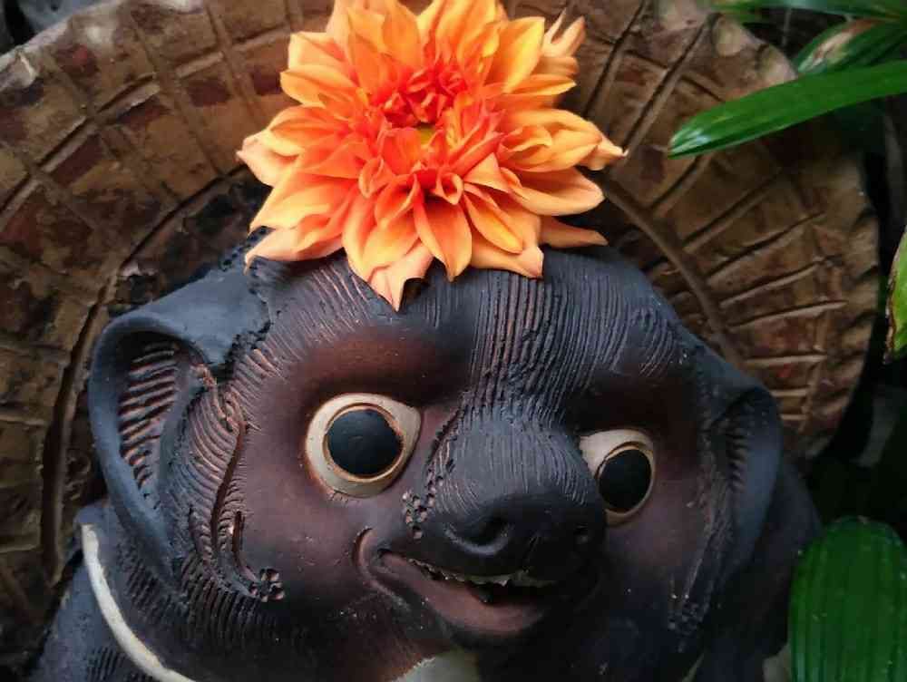庭のダリアを信楽焼のタヌキさんの帽子に(笑)