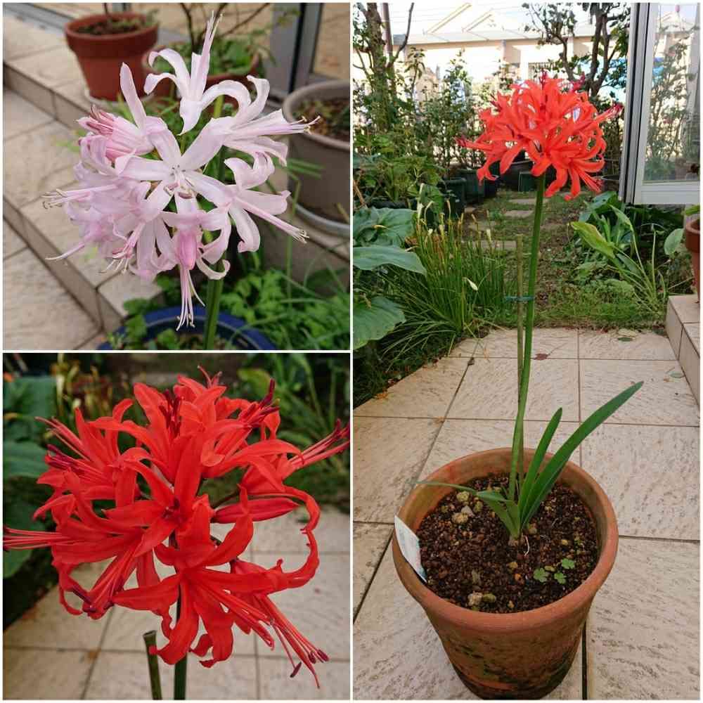 ネリネ(ダイヤモンドリリー)のお花。彼岸花を仕舞って、やっと咲きました。桃色系の絞り咲きも一緒に咲いています。花期が長いので楽しめますね。綺麗です❣️❗。