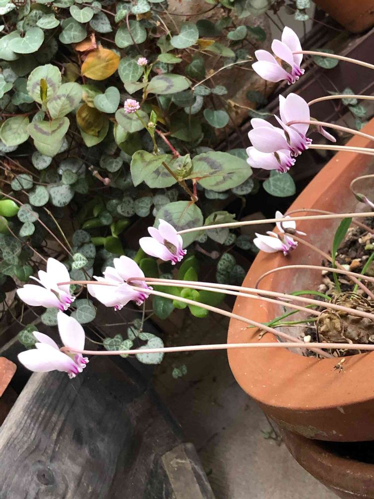 球根を植えずに土の上に置きっぱの原種シクラメン。いつの頃からか球根に大きな穴が空いてしまいましたが、毎年花を咲かせてくれています。今年も星にならずにいてくれました。