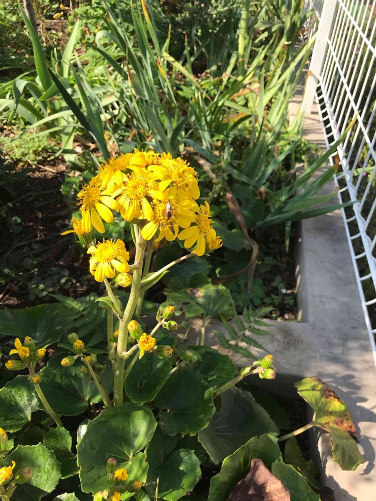 ツワブキの花が咲きました。蜂が蜜を吸っていました。🐝🌼