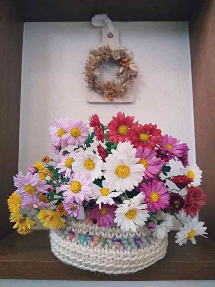 コギクは和風のイメージ強いけど、ハイビスカスさんの麻カゴに生けたら洋風のイメージになって気に入ってます😊💕