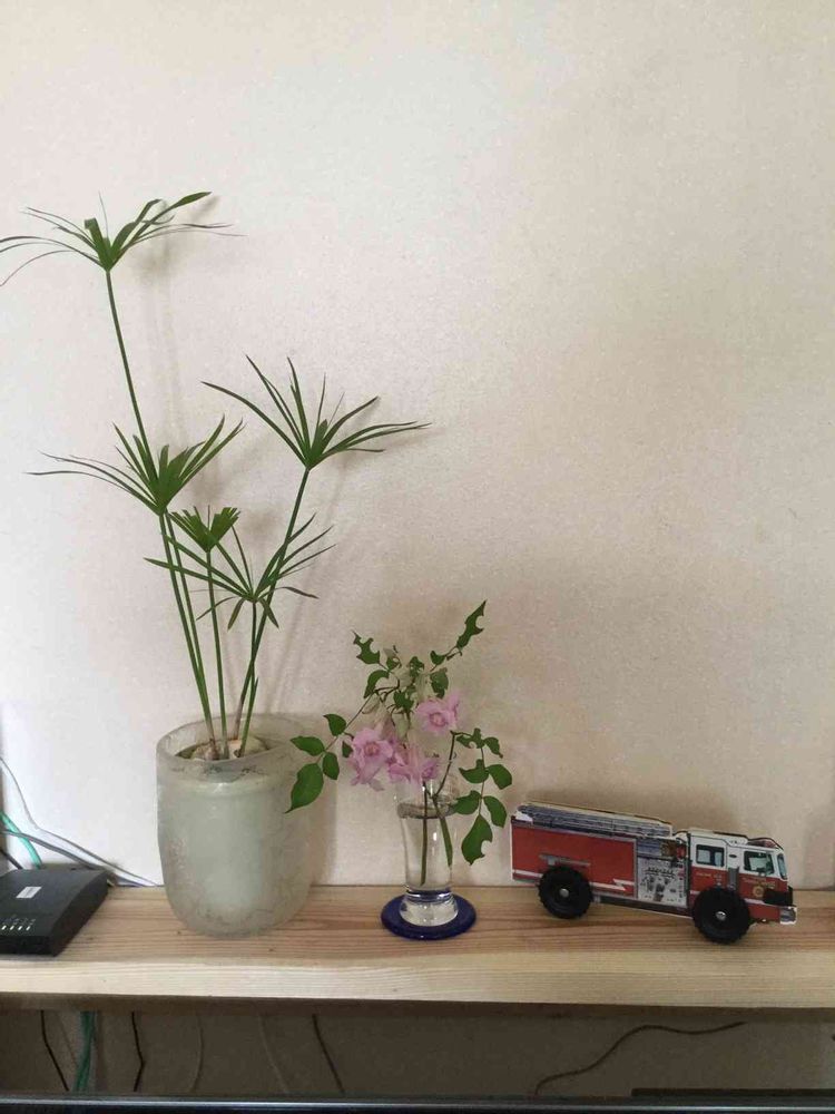 夫が散歩から手折ってきた花が優しげでいい^_^カヤツリグサと合わせて。