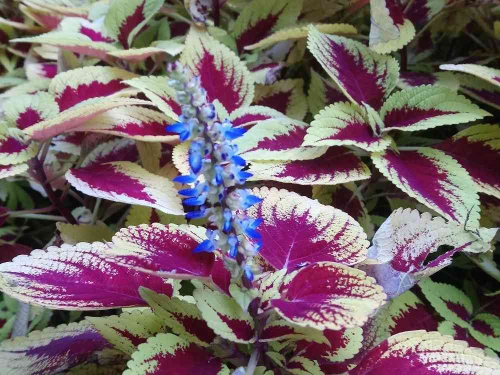 葉が鮮やかなコリウスの花は綺麗なブルーでした。植物は虫さん達に見つけてもらうために頑張ってるんだろうな~
