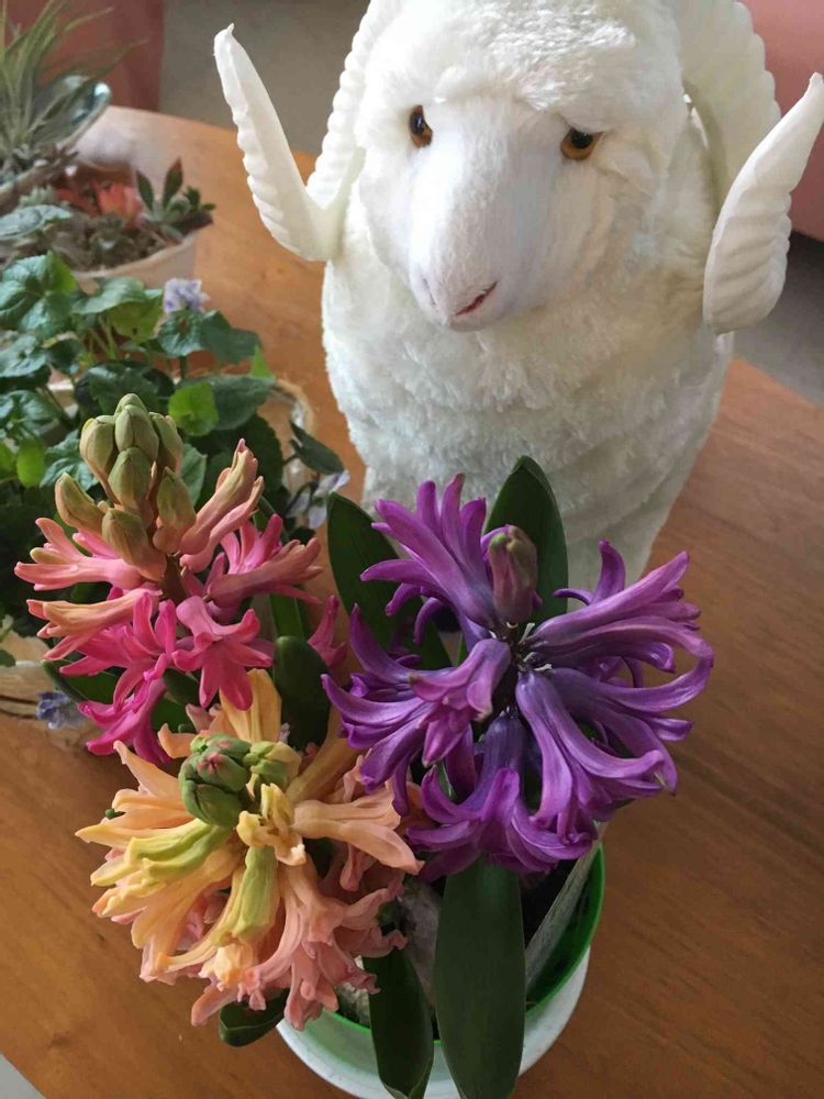 こんにちは😀ヒヤシンス🎵アプリコット調の色が可愛いわぁ❣️ヒツジさんとコラボが又癒される〜(◦ˉ ˘ ˉ◦)