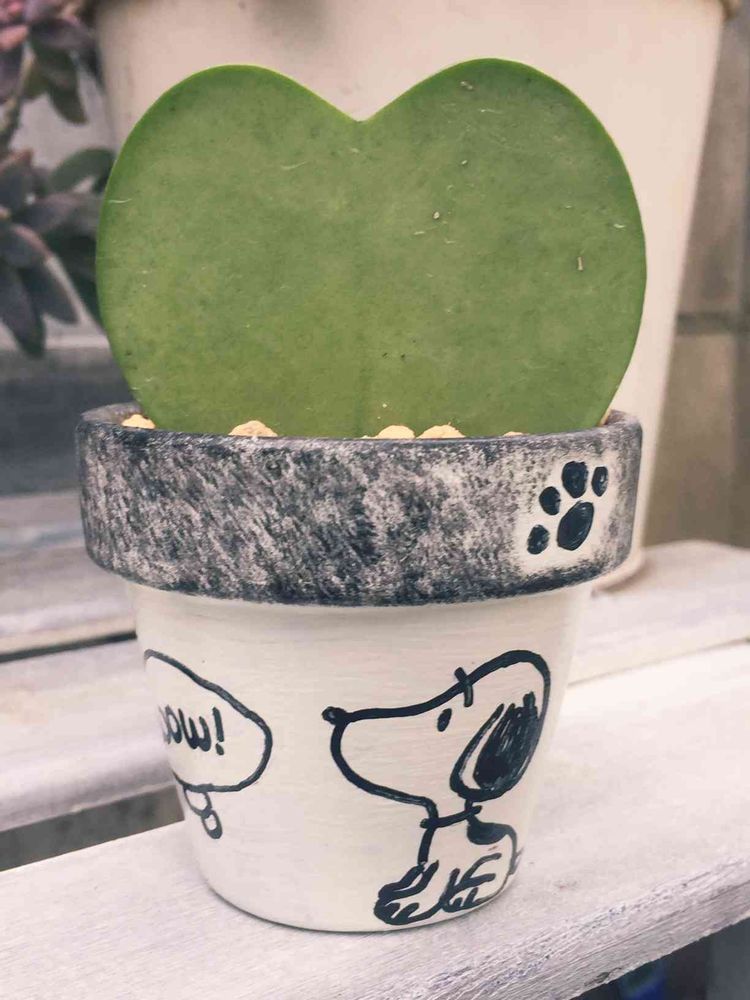 前に作ったスヌーピーのリメ鉢に植えてみました💕