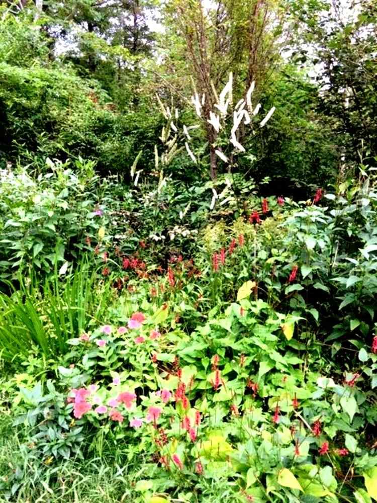 手前からオオベンケイソウとペルシカリア、様々な色、形の葉、そして奥にサラシナショウマが宙に浮いているようです。