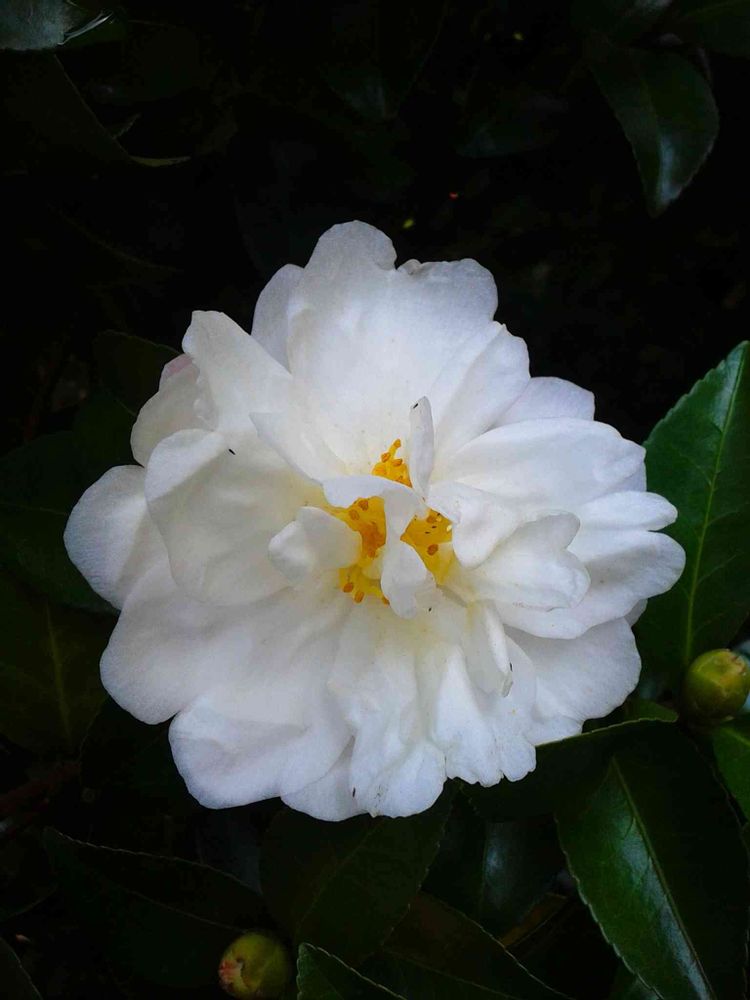 八重咲の山茶花なので、花が咲いても強い風や鳥につつかれて、落ちてしまうので、下には白い花びらが…。