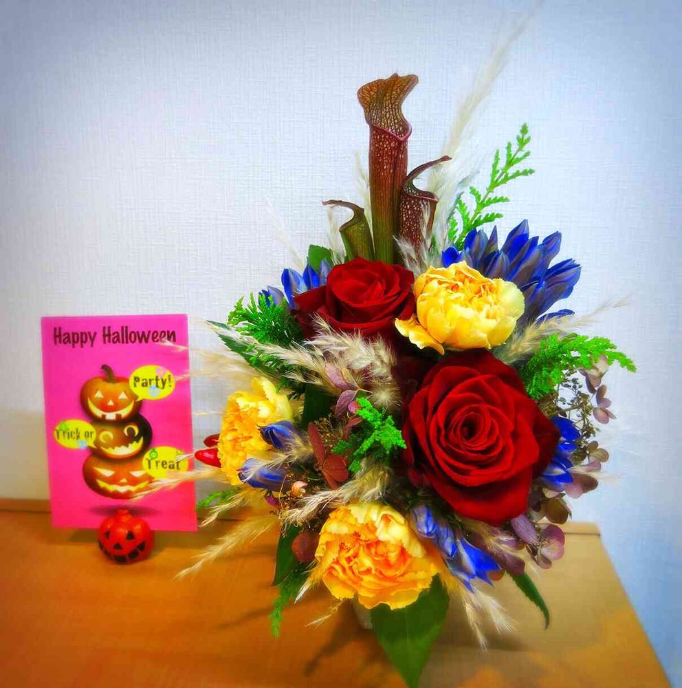 どうもありがとうございます。ハロウィン風のアレンジを狙って食虫植物を使って👻オバケっぽくしました