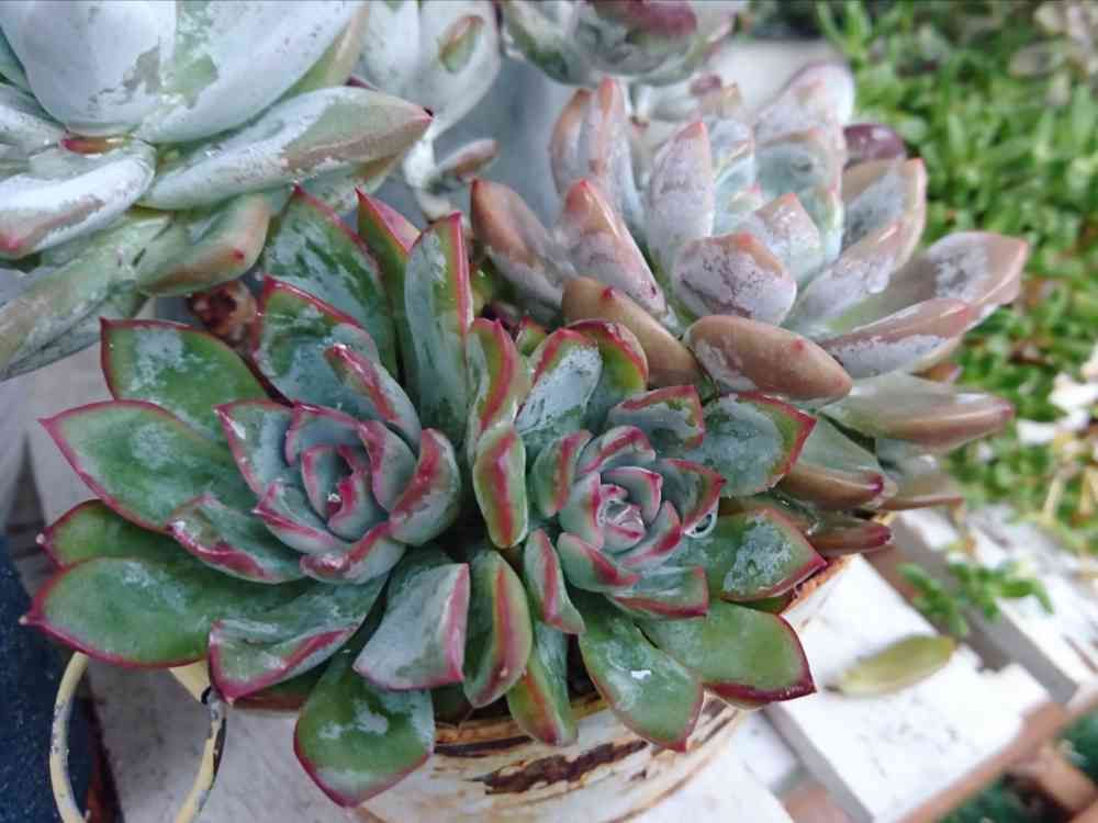 昨夜お水あげたら朝もびたびたのままだった😅急に朝晩冷えて多肉の色が変わってきました😊