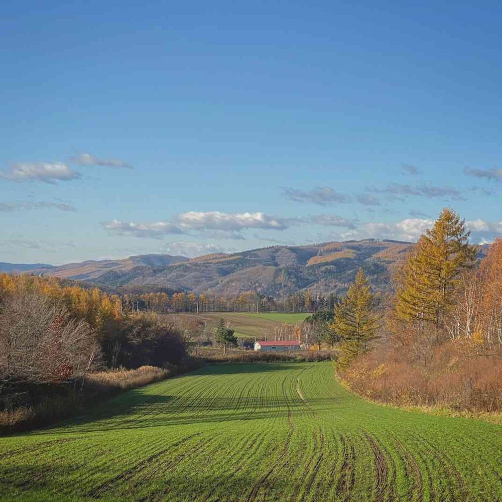 紅葉に山々に麦の緑💚そして青空💙