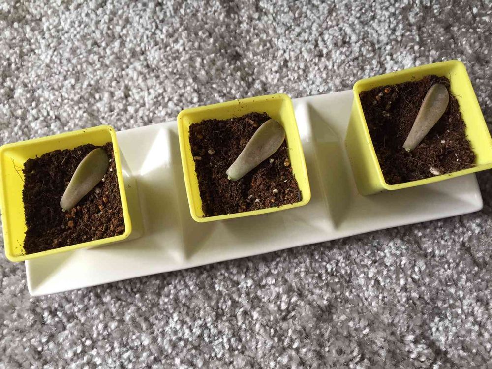 ダイソーの多肉ちゃんが入っていた容器へ朧月の子供を移す。