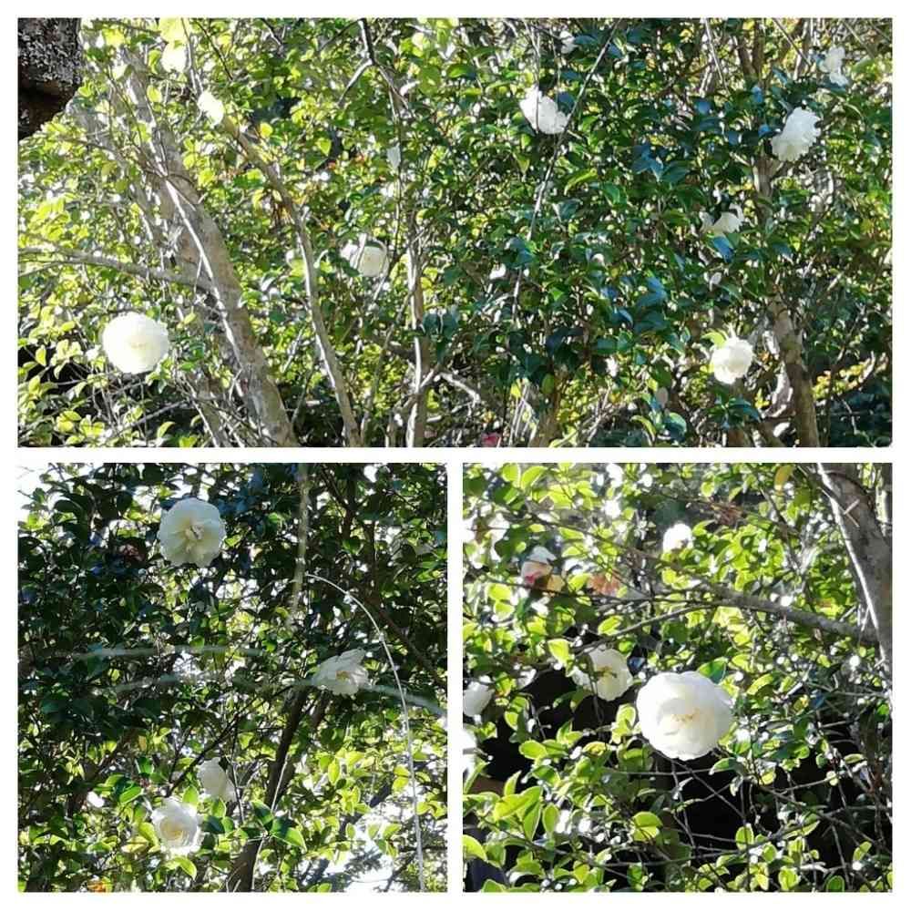赤い山茶花の木の上に、白い山茶花の花も咲いてます。