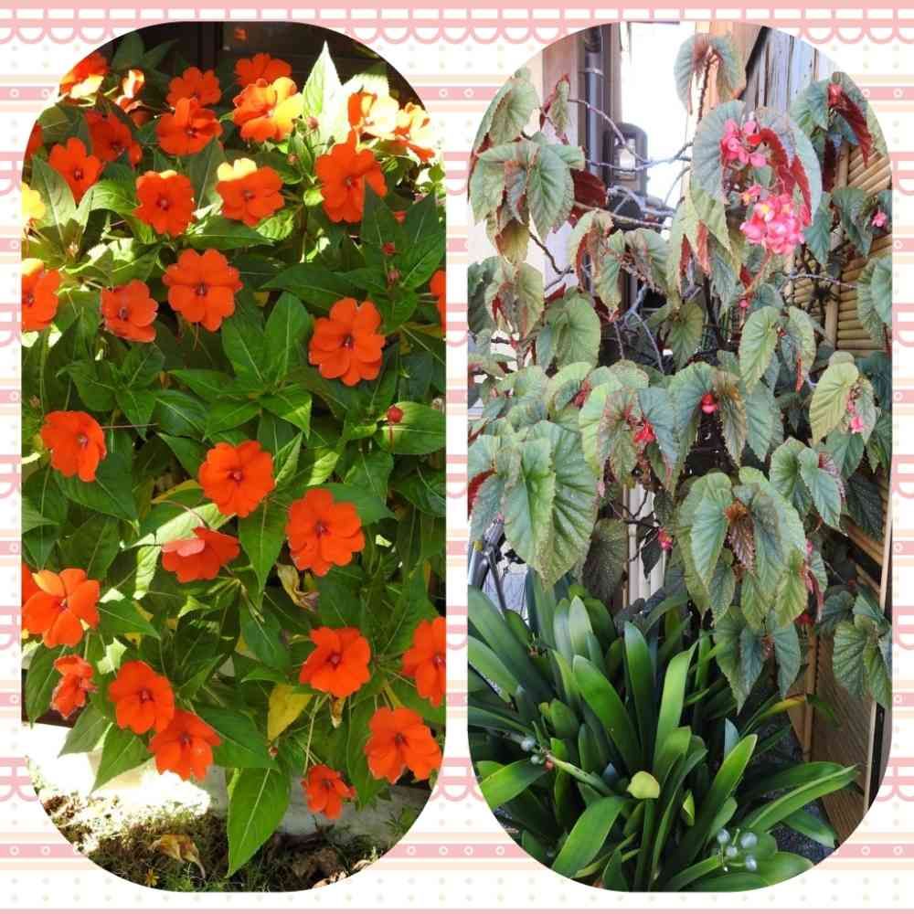 町家の玄関先で🌸咲くインパチェンスと立木ベゴニアの花🌸
