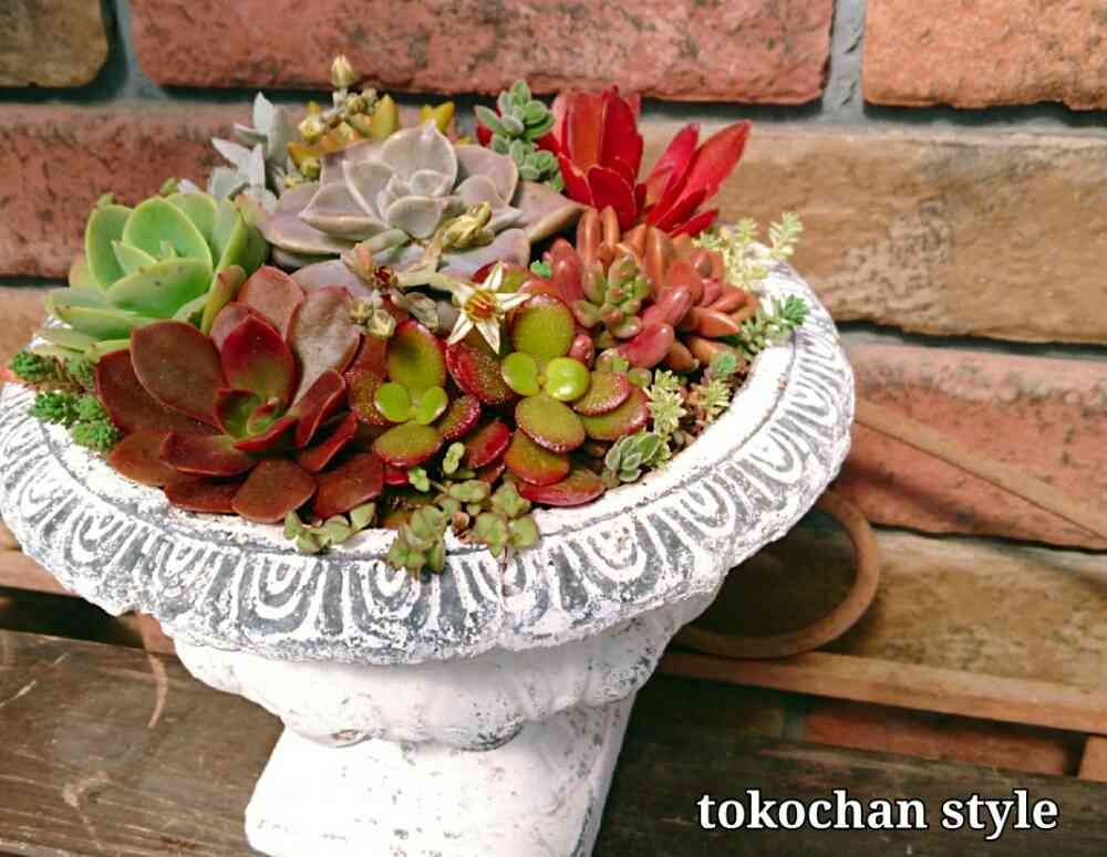 アンティーク風の鉢に多肉の寄せ植えが好き。ちっちゃな花が咲いているのがキュートでしょ(’-’*)♪。