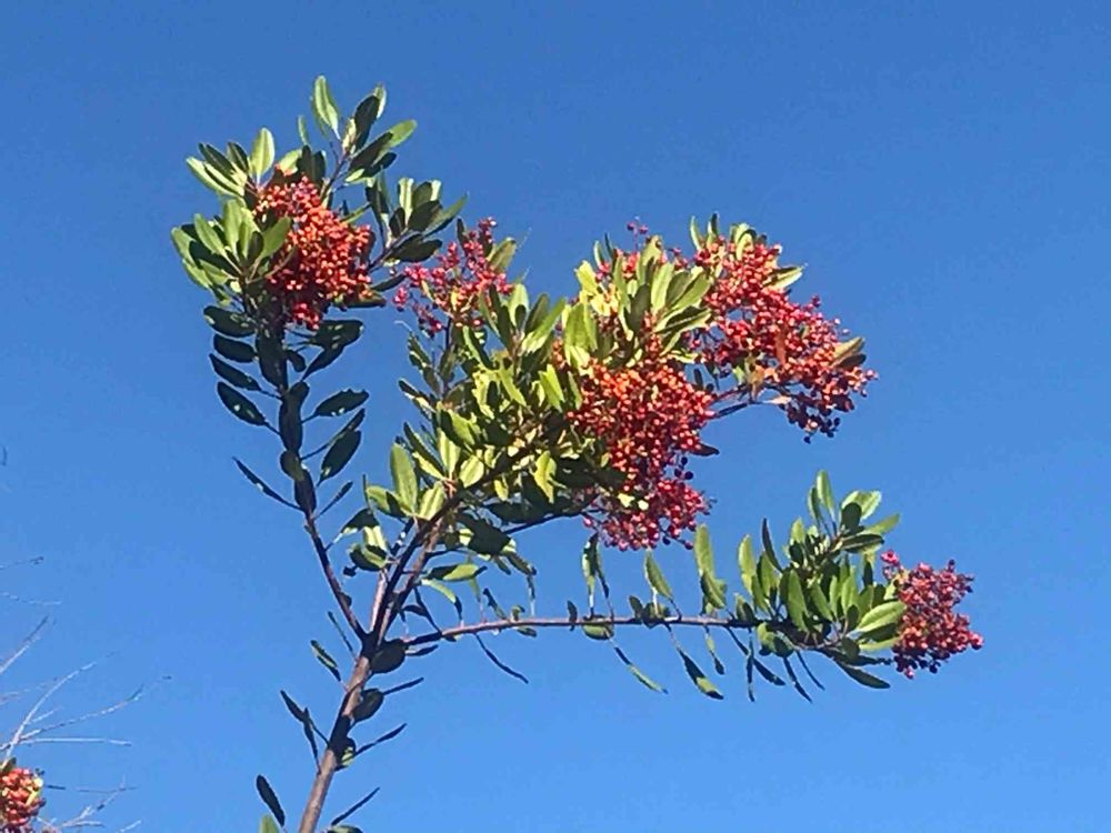 青が深い秋空を背景にした Toyon。赤い実と青空のコントラストがきれいでした。