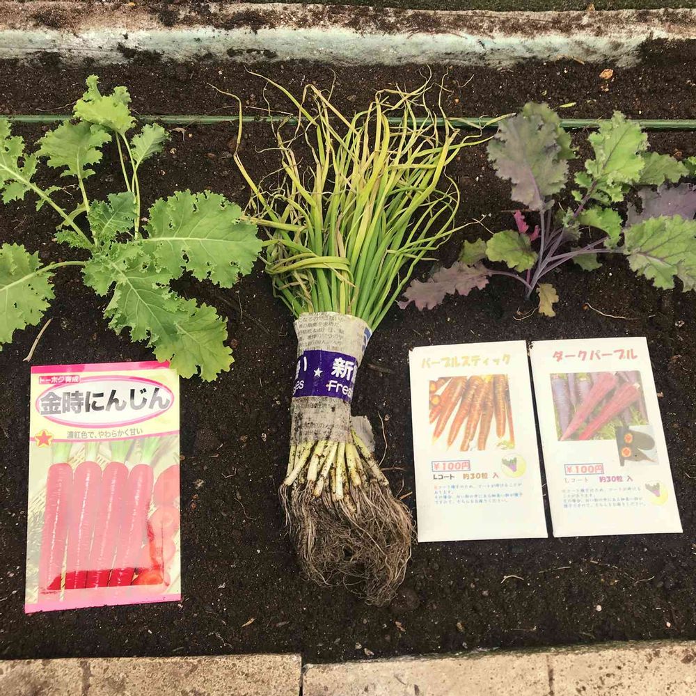 ここに、他のプランターで種から育てていたハルプホーヘルケールとレッドカーリーケールを移植してタマネギの苗を植え付け、一緒にクリムソンクローバーを撒きたかったのですが、会社に種を持って行ってしまっているので匂いの出る葉っぱと思ったらニンジン🥕の種しか残っていなかったのでこれを撒きました