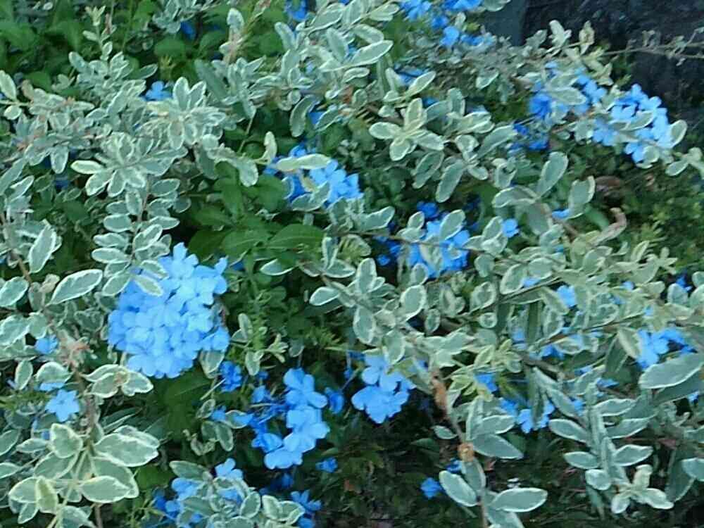 ルリマツリのつるが延びて隣の斑入りプリペットに侵入。プリペットが花咲いているようになってます💡💗
