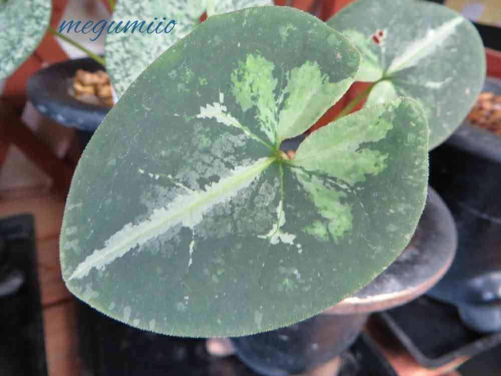 細辛の新品種でまだ名無しです。蝶(ちょうちょみたいな模様の所)の鮮やかなグリーンが特徴で、この系統の中では上のランクに入る斑芸です。無事増えますように・・・