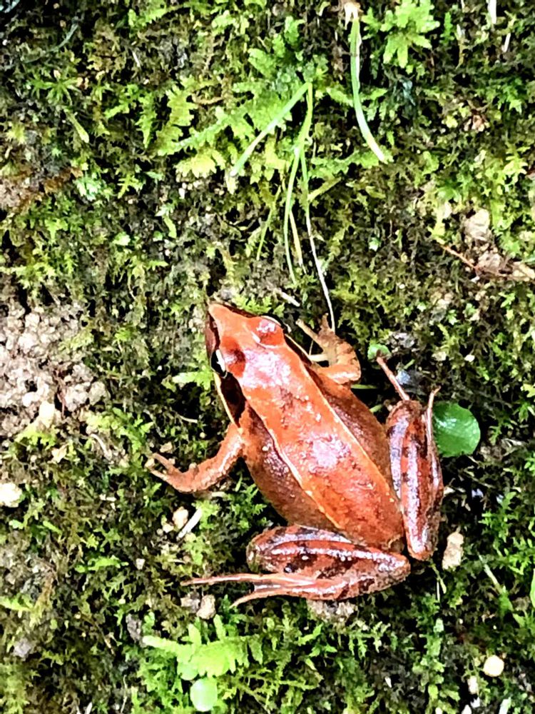 最初、フツーのカエルが周りの色に擬態してるのかと思ったんですが、それにしても赤過ぎるので調べたらアカガエルでした😊
