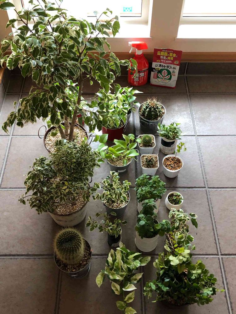 オルトランとベニカを撒いて、観葉植物とサボテン達は玄関で乾燥待ち☆